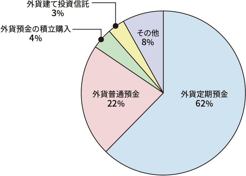 回答内容 割合 外貨定期預金 62% 外貨普通預金 22% 外貨預金の積立購入 4% 外貨建て投資信託 3% その他 8% 運用可能な資産総額 ※不動産を除く