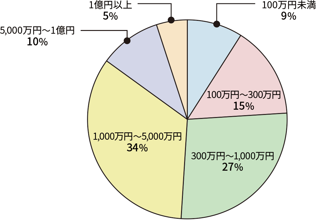 回答内容 割合 100万円未満 9% 100万円~300万円未満 15% 300万円~1,000万円未満 27% 1,000万円~5,000万円未満 34% 5,000万円~1億円未満 10% 1億円以上 5% - TOPICS2
