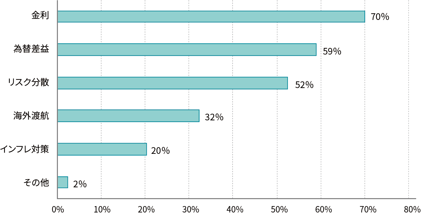回答内容 割合 金利 70% 為替差益 59% リスク分散 52% 海外渡航 32% インフレ対策 20% その他 2% - TOPICS3