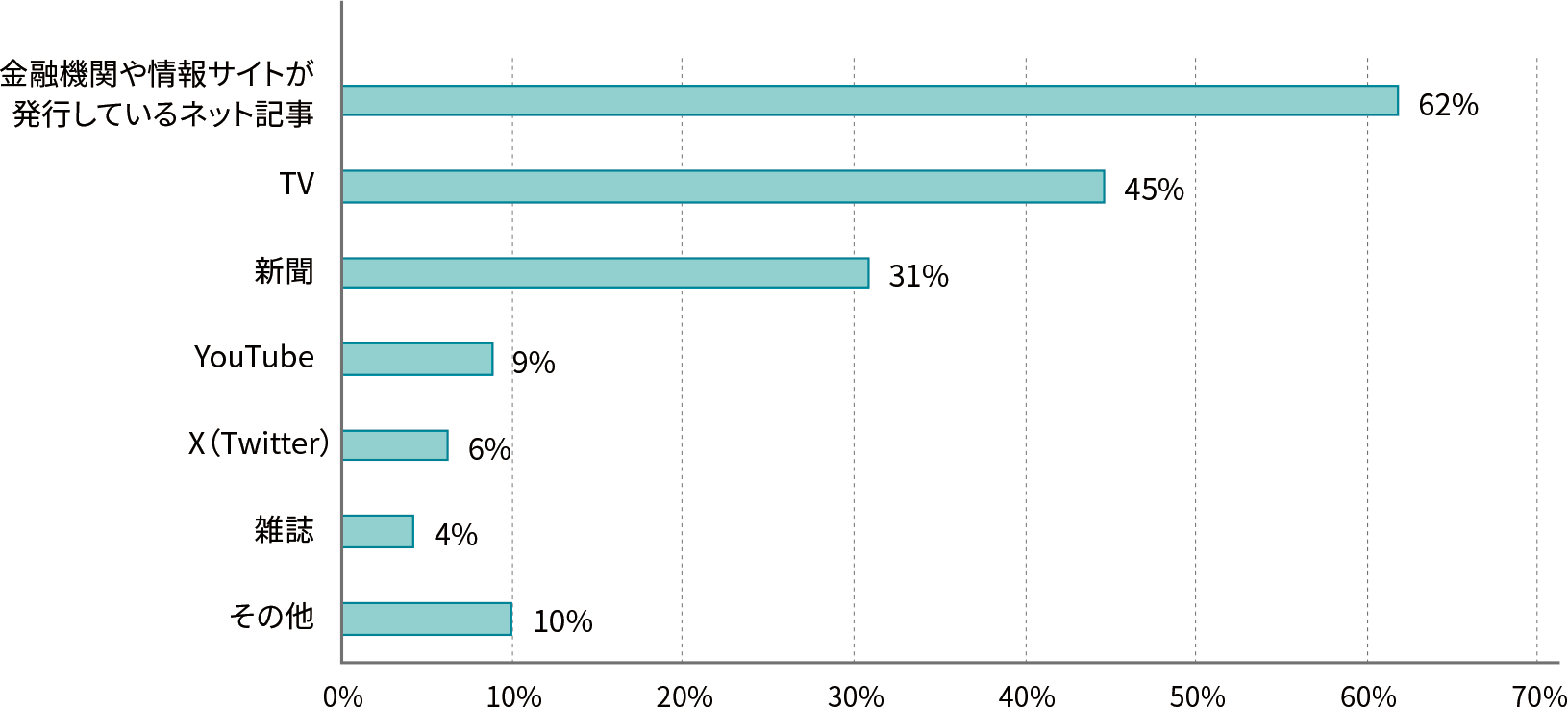 回答内容 割合 金融機関や情報サイトが発行しているネット記事 62% TV 45% 新聞 31% Youtube 9% X(Twitter) 6% 雑誌 4% その他 10% - TOPICS4