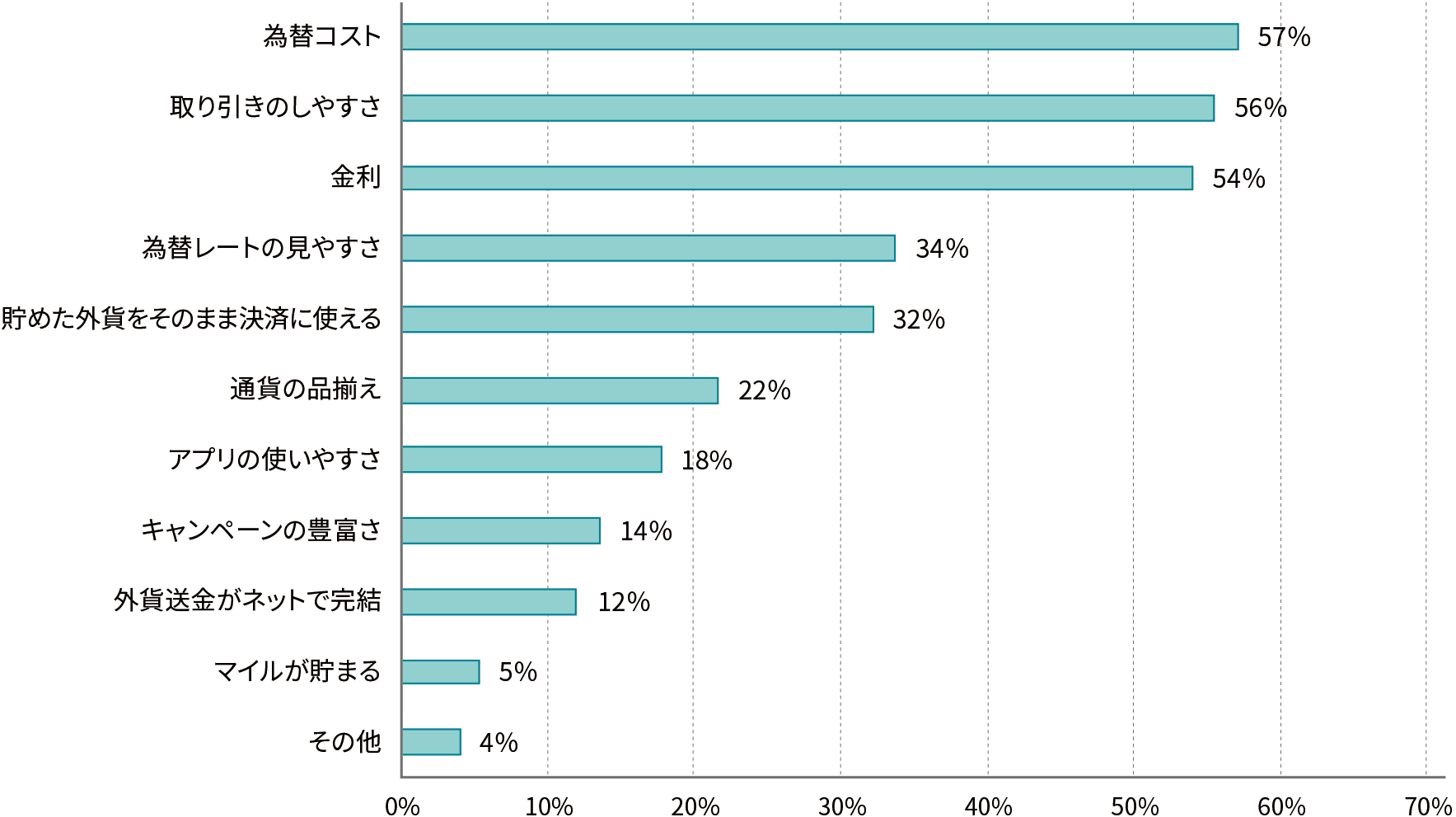 回答内容 割合 為替コスト 57% 取り引きのしやすさ 56% 金利 54% 為替レートの見やすさ 34% 貯めた外貨をそのまま決済に使える 32% 通貨の品揃え 22% アプリの使いやすさ 18% キャンペーンの豊富さ 14% 外貨送金がネットで完結 12% マイルが貯まる 5% その他 4% - 2023年 オリコン顧客満足度®調査「外貨預金」にて4年総合連続1位を獲得