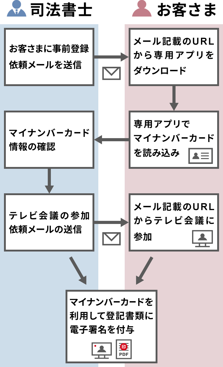 - 司法書士がテレビ会議の参加依頼メールを送信しますので、メール記載のURLからテレビ会議で司法書士と面談を行ってください。その際にマイナンバーカードを利用して登記書類に電子署名を付与いただきます。