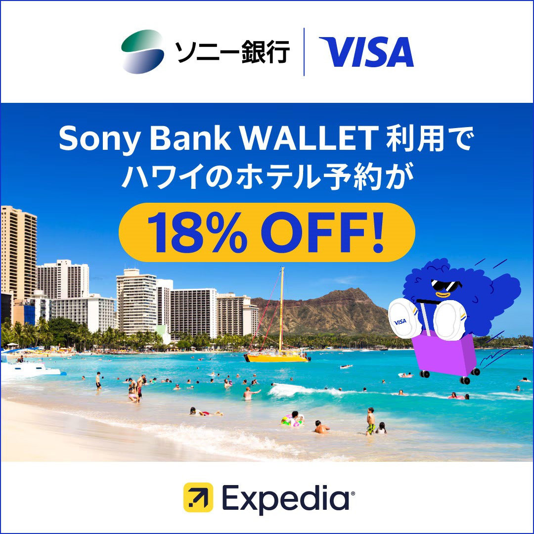 | 内容 | Sony Bank WALLET とエクスペディアの共同キャンペーンページからハワイのホテル予約の際、決済ページにて専用クーポンコードを入力し Sony Bank WALLET で決済すると、ハワイのホテル料金が18%割引となります。(上限割引金額:1回あたり30,000円) |