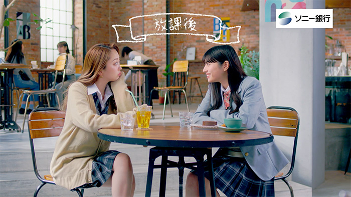 アルバイトの面接に受かり、憧れの先輩(のせりんさん)と同じバイト先という嬉しさから妄想を繰り広げる女子高生役の向井怜衣さんに対して、親友役のみりちゃむさんが冷静に突っ込み、アルバイト準備としての口座開設は終わったのか、まだならソニー銀行がオススメと伝える内容になっています。