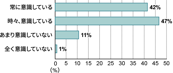 現在の節約意識についてうかがったところ、「常に意識している」が42%、「時々、意識している」が47%となり、合わせて約9割のかたが節約を意識していました。
