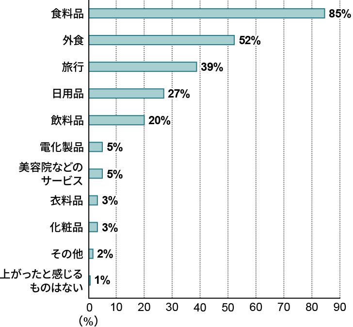 回答 割合 食料品 85% 外食 52% 旅行 39% 日用品 27% 飲料品 20% 電化製品 5% 美容院などのサービス 5% 衣料品 3% 化粧品 3% その他 2% 上がったと感じるものはない 1% 現在、節約しているもの(3つまで選択)
