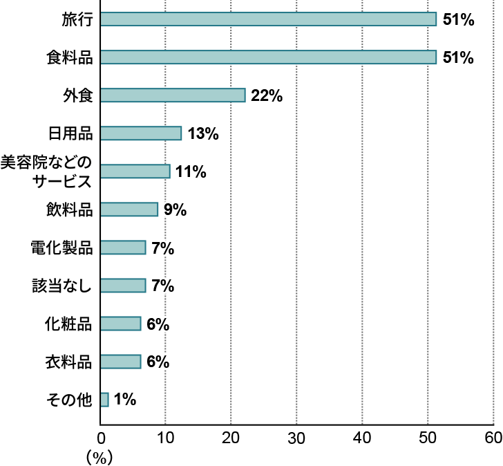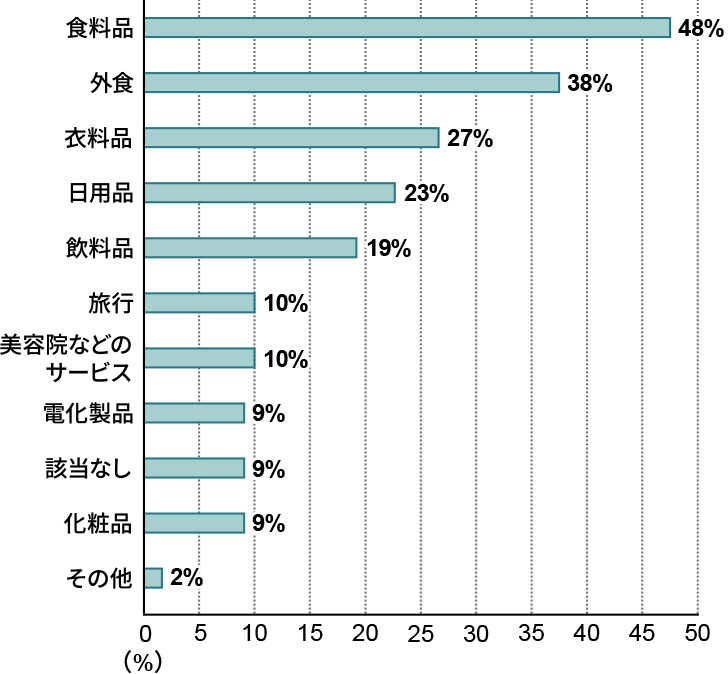 回答 割合 食料品 48% 外食 38% 衣料品 27% 日用品 23% 飲料品 19% 旅行 10% 美容院などのサービス 10% 電化製品 9% 該当なし 9% 化粧品 9% その他 2% - TOPICS2