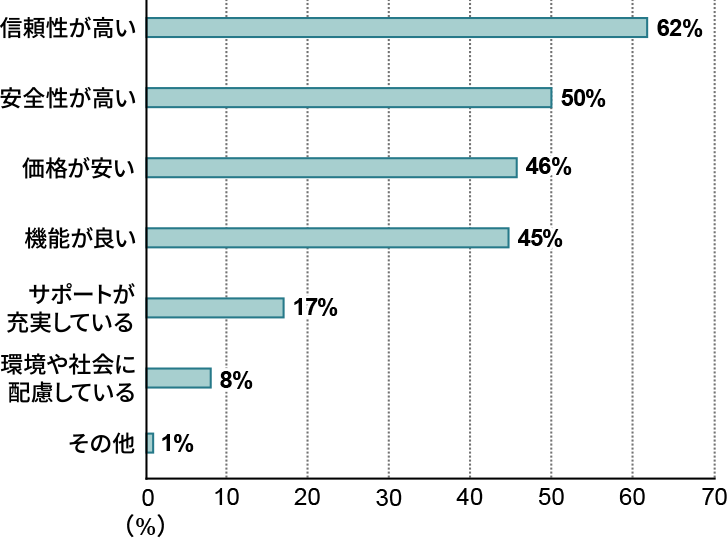 回答 割合 信頼性が高い 62% 安全性が高い 50% 価格が安い 46% 機能が良い 45% サポートが充実している 17% 環境や社会に配慮している 8% その他 1% 価格が上がっても、お金をかけたいもの(3つまで選択)