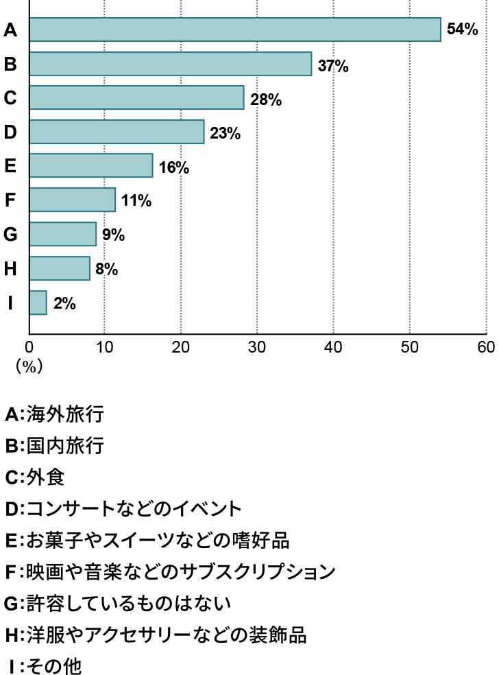 回答 割合 海外旅行 54% 国内旅行 37% 外食 28% コンサートなどのイベント 23% お菓子やスイーツなどの嗜好品 16% 映画や音楽などのサブスクリプション 11% 許容しているものはない 9% 洋服やアクセサリーなどの装飾品 8% その他 2% - TOPICS4