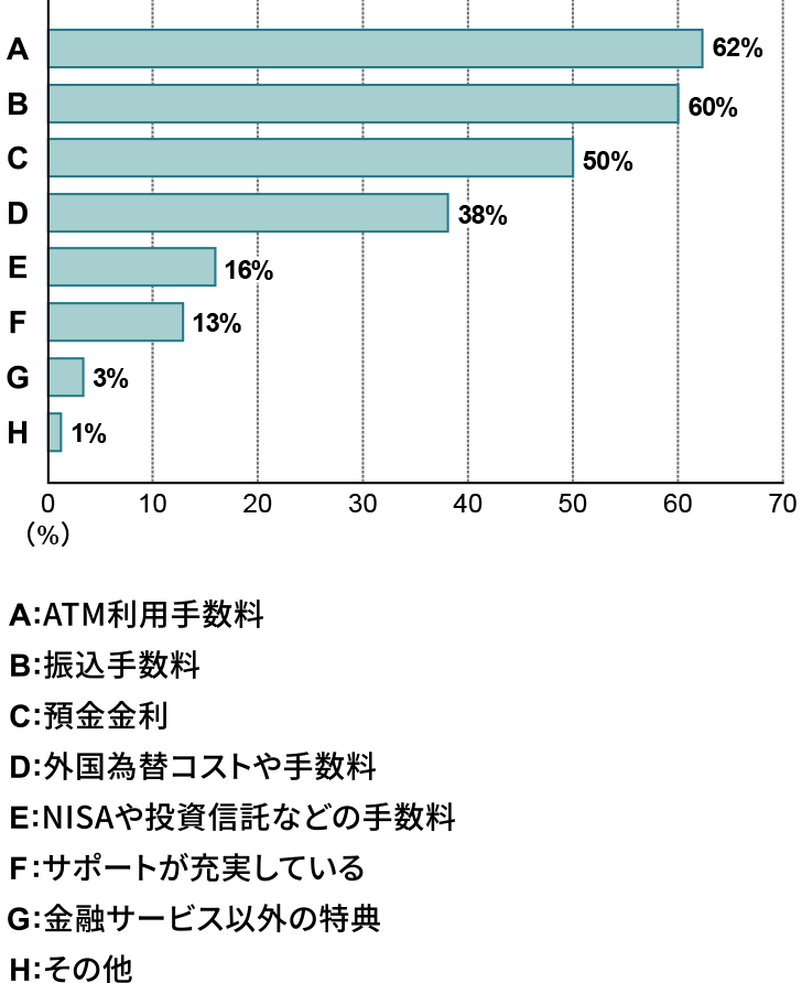 回答 割合 ATM利用手数料 62% 振込手数料 60% 預金金利 50% 外国為替コストや手数料 38% NISAや投資信託などの手数料 16% サポートが充実している 13% 金融サービス以外の特典 3% その他 1% 物価が上昇する中、クレジットカードやデビットカードで重視すること(3つまで選択)
