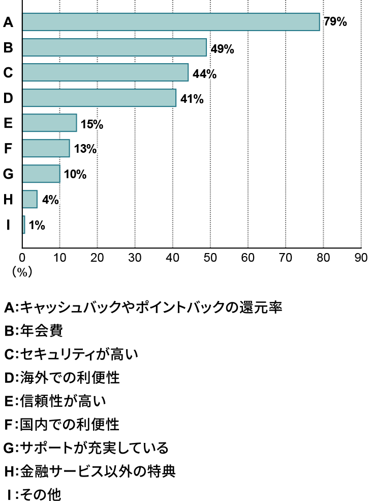 回答 割合 キャッシュバックやポイントバックの還元率 79% 年会費 49% セキュリティが高い 44% 海外での利便性 41% 信頼性が高い 15% 国内での利便性 13% サポートが充実している 10% 金融サービス以外の特典 4% その他 1% - TOPICS5