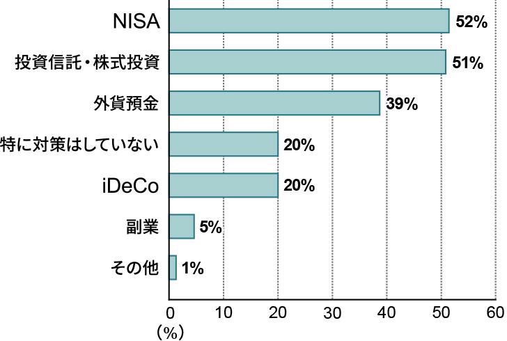 回答 割合 NISA 52% 投資信託・株式投資 51% 外貨預金 39% 特に対策はしていない 20% iDeCo 20% 副業 5% その他 1%