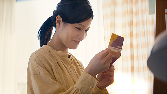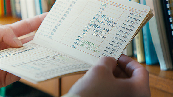 本CM「思い出の口座編」では、主人公の女性が0歳の娘を連れて実家を訪れたことから物語が始まります。母に娘を預けて、自分自身の部屋に向かい本棚の本を手に取ると、本の間から古い通帳が現れます。その通帳には「なな誕生 出生体重預金」「初めての子育て。お母さん頑張るからね」「どんな場所で何をしていても 母はあなたの味方だよ」など、母が長い年月をかけて積立をし、同時に書き残していった想いのメモがあり、子ども時代の母との思い出が一気によみがえります。