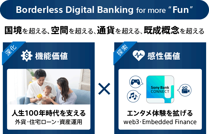 ソニー銀行は「Borderless Digital Banking for more “Fun”」をコンセプトに、国境・通貨・空間の垣根を超えて、人生100年時代における個人と家族の安心を支える機能価値と、エンタテインメントとの連携を通じた体験の場の拡張や不の解消による感性価値を創出し、お客さまに新たな感動体験・価値提供を目指して挑戦を続けていきます。