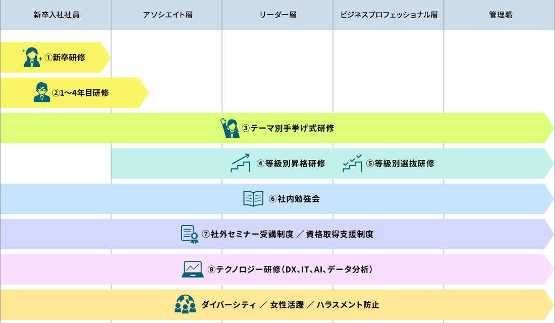 各等級で対象者を選抜し、キャリア形成やビジネススキル、経営戦略策定のプロセスを学ぶための研修です。