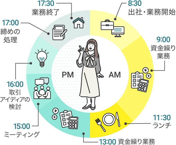 午後には調達・運用する金額を確定させます。隙間時間には、マーケット情報収集のためにレポートやニュースに目を通しています。