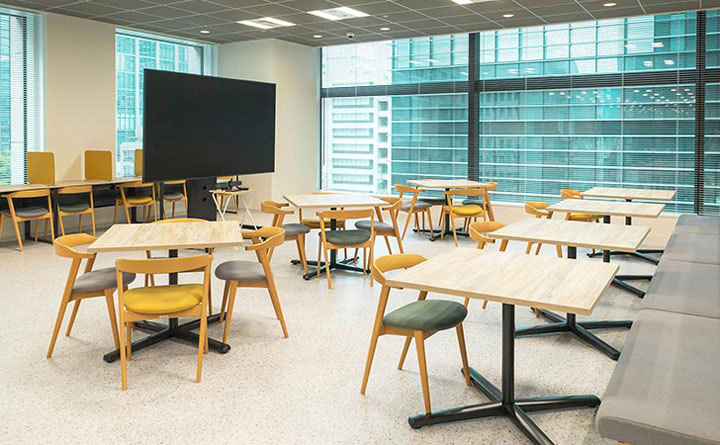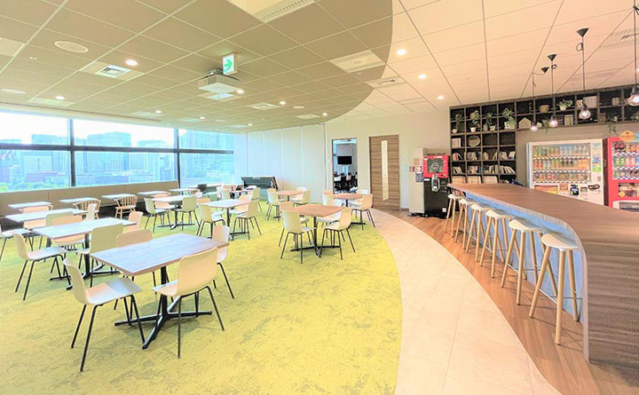 社員専用ラウンジは、社員が業務の合間に休憩できるように緑を基調としたレイアウトになっています。