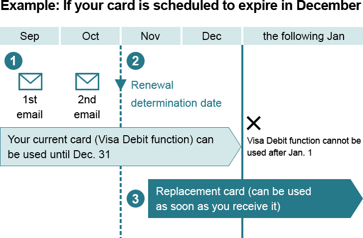 If you have not used your card's Visa Debit function within the last three years as of the renewal determination date, Sony Bank will send you a regular cash card without issuing you a replacement card of Sony Bank WALLET. When using your new cash card at an ATM, you will no longer be able to use your old Sony Bank WALLET's cash card function. Please dispose of your old card after cutting it up.