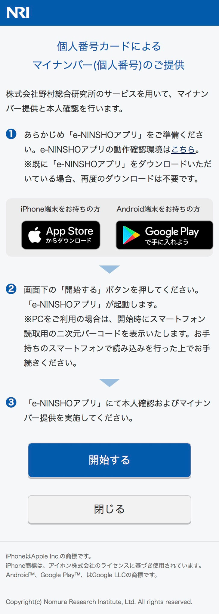 「次へ」を押した後、株式会社野村総合研究所のウェブサイトへ遷移しますので、「閉じる」を押してください。
