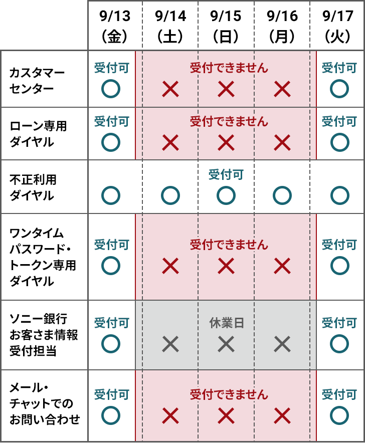 2024年9月12日(木)午後5:00~9月17日(火)午前5:00の期間、キャッシュカードからデビットカードへの切り替え、再発行、退会(オンラインによる受付、タカシマヤプラチナデビットカード、ANAマイレージクラブ / Sony Bank WALLET を含む)は、受付を停止します。