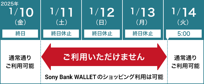 2025年1月9日(木)午後5:00~1月14日(火)午前5:00の期間、キャッシュカードからデビットカードへの切り替え、再発行、退会(オンラインによる受付、タカシマヤプラチナデビットカード、ANAマイレージクラブ / Sony Bank WALLET を含む)は、受付を停止します。