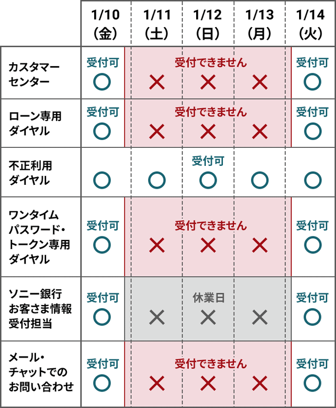 返済日が土曜、日曜、祝日などと重なった場合は、ソニー銀行の翌営業日が返済日となるため、1月12日(日)のご返済は翌営業日となる1月14日(火)にスライドします。
