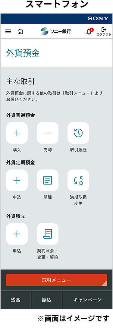 - 取引がスムーズに行えるように、ログイン後の各対象商品トップ画面に主要な取引をアイコンで表示