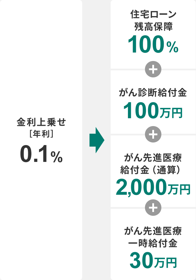 年利0.1%の金利上乗せで、がんと診断確定時に住宅ローン残高0円+100万円を保障。さらに、がん先進医療で通算2,000万円+一時金30万円、がん保障特約で保障されない上皮内がん・皮膚がんの場合も50万円をお支払。