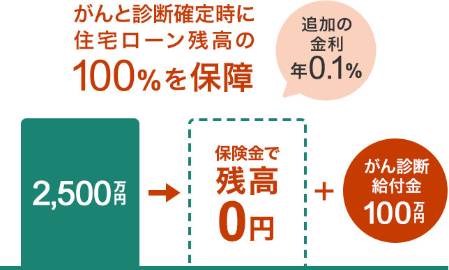 年利0.1%の金利上乗せで、がんと診断確定時に住宅ローン残高0円、さらに100万円のがん診断給付金を保障。