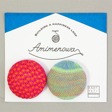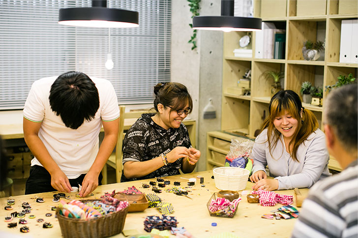 廃材になるはずだったニット達に、人と社会をあたたかくつなげて欲しい。そんな想いからはじまったプロジェクトです。障がい者支援施設に残糸、残布を使ったマグネット、ピンバッジなどの小物の作成を依頼し、同社が100%仕入れてKNOT YET!ブランドとして販売します。このプロジェクトでは障がい者支援施設がこれまで請け負っていた仕事の2倍に当たる賃金を支払い、売上の一部はNPO法人NOBELを通じ、病児保育支援活動に役立てられます。昨年から2つの障がい者支援施設で取り組みを開始し、現在は3つの施設との取り組みに増えています。今後はピアスやイアリング、ポーチなどの新企画も依頼して販売活動を広めていく予定です。
