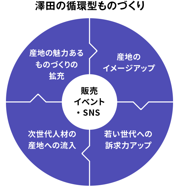澤田株式会社は販売イベントやSNSなどを通じて、世の中に広く産地商品を知っていただく機会を作ることができます。これによって更なる産地のイメージアップという好循環なものづくり社会を提案したいと考えています。