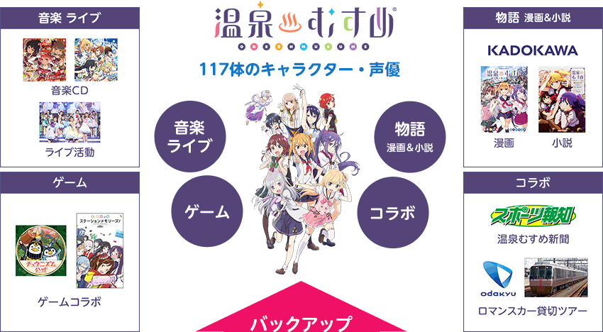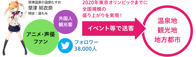「地域活性クロスメディアプロジェクト」として、アニメや漫画、キャラクターや声優などのキャラクターIPを通して、日本各地の温泉地や地方都市の魅力を国内外に発信。音楽ライブやトークイベントを地方都市で積極的に開催。漫画や小説、ゲームなどの様々なメディアで展開を行い、コラボやタイアップなども積極的に実施。