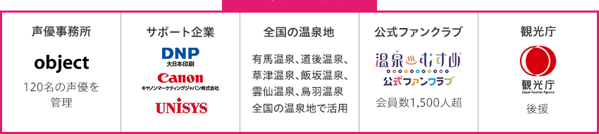 日本全国の温泉地をモチーフにキャラクター化を行い、地方を盛り上げるお手伝いをしています。最大の特徴は、キャラクターすべてに別々のイラストレーターと声優を起用していることです。多くのクリエイターや声優に「温泉むすめ」に参加いただくことで、皆さんで地方都市や温泉地を盛り上げたいという願いが込められています。