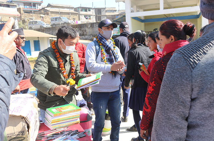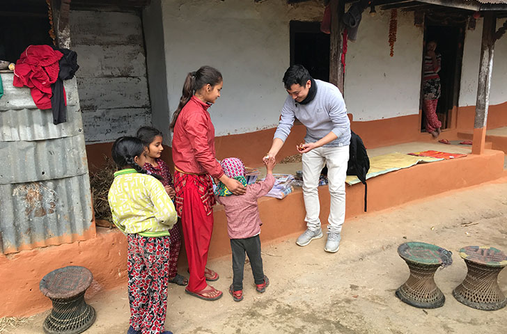 要では、ネパール支援活動を行っています。子どもたちには、文房具・玩具であったり、寒さが厳しい冬には衣服などを自らの手で寄贈しています。2021年1月27日にはネパールの企業および団体と協力して、150名の学生たちに防寒着・文房具配布の支援と19名の先生たちに日記とペンの支援を行いました。