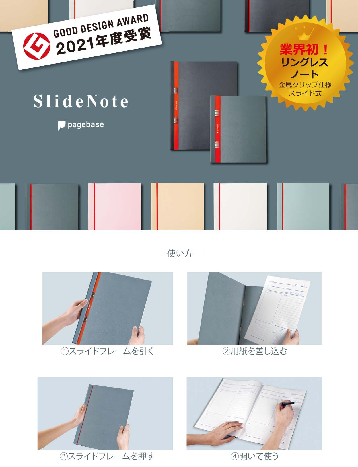 審査委員の評価は「ノートやファイルとしての用途だけでなく、ファイルから簡単に外しスキャニングをしやすくするなど、デジタルツールとともに使用するシーンを視野に入れて開発された、着脱が簡単な仕組みのノート/ファイル。できるだけ無駄な用紙を使わないサイクルを目指して作られた新しい試みが評価された」とのことでした。
