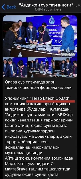 U’zsuvtaminotと合弁会社を設立し物件への浄化槽設置事業に投資、使用料を徴収する仕組みについて話を頂きました。