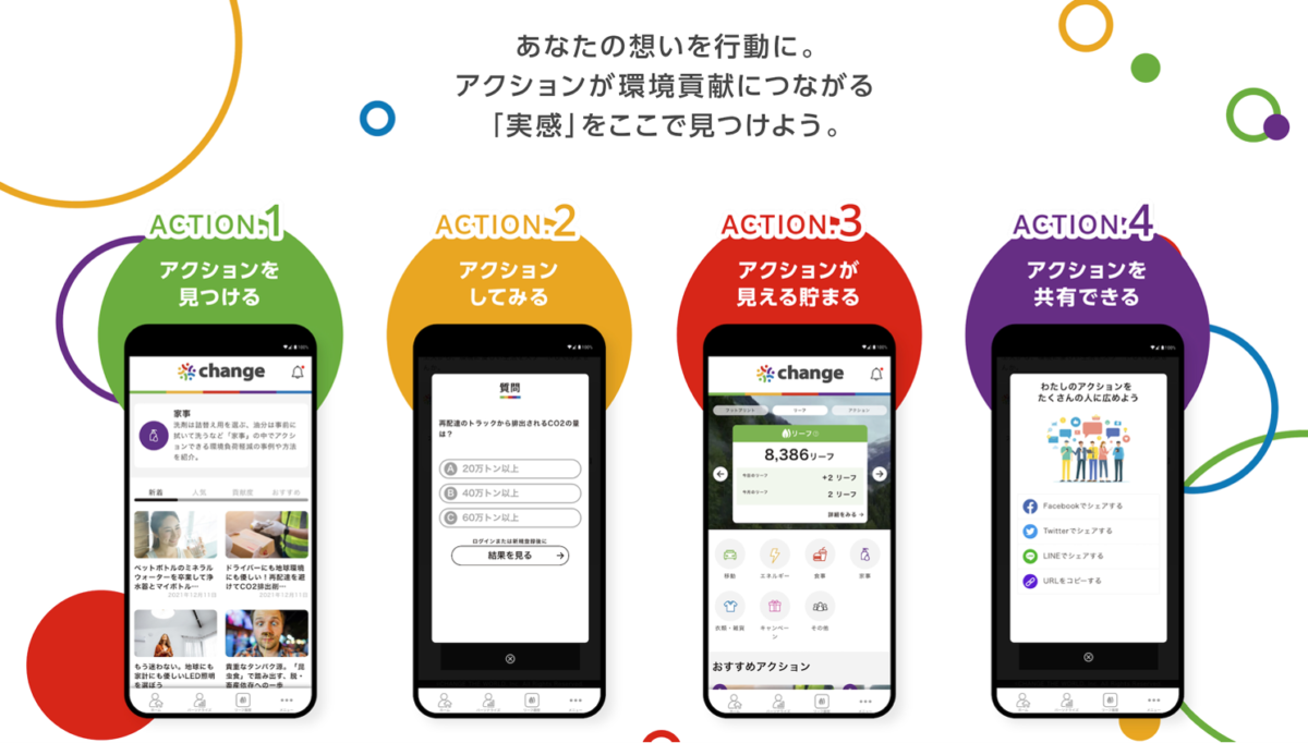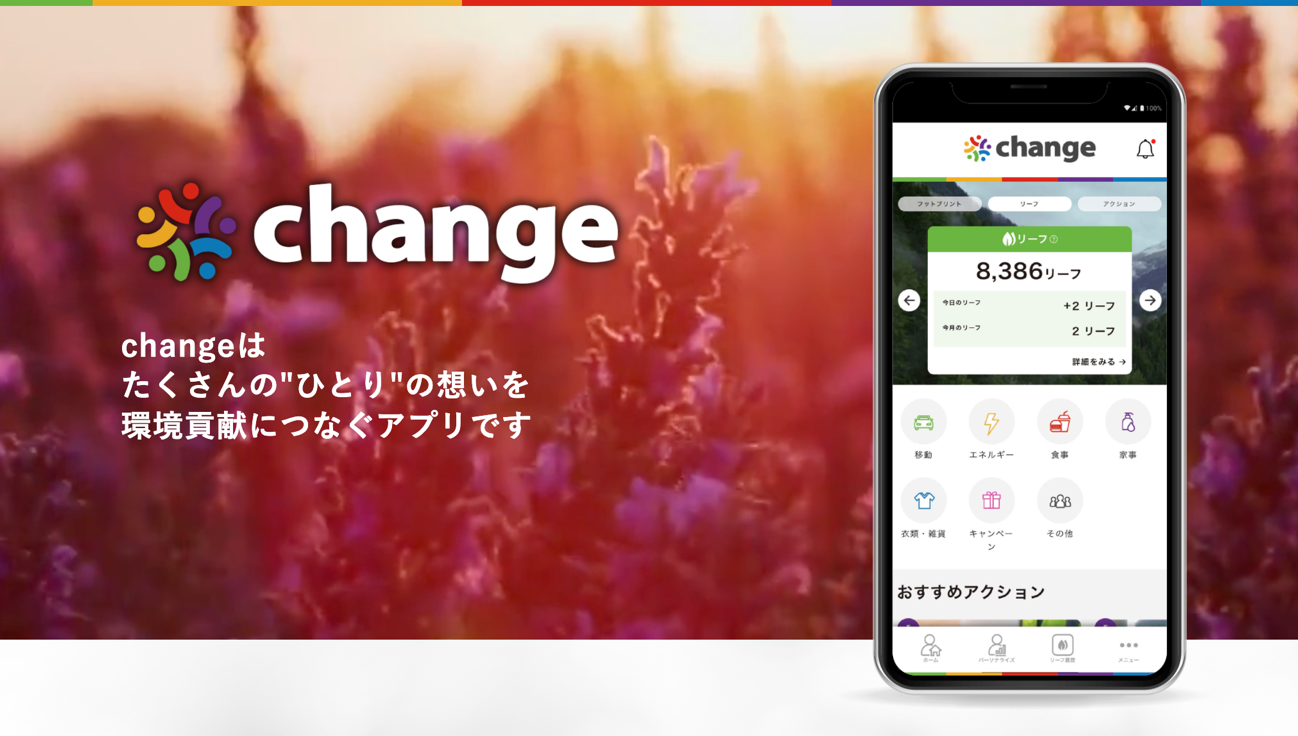 「change」は、たくさんの”ひとり”の想いを環境貢献につなぐ環境アクションプラットフォームです。誰でも簡単に、個人のカーボンフットプリント(CO2の推定排出量)を計測し、環境負荷を減らす行動である「環境アクション」を行うことができます。