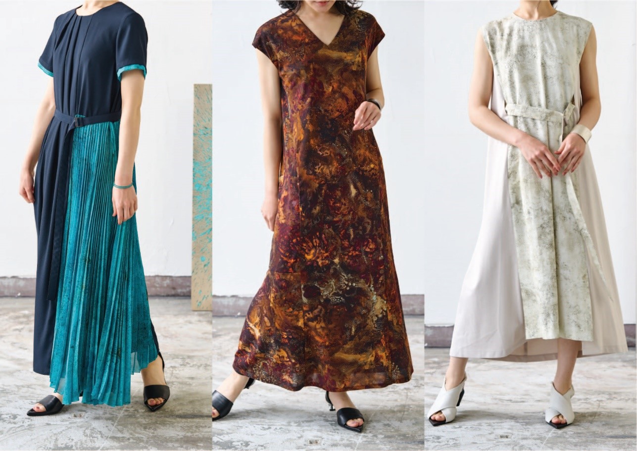 伝統工芸「高岡銅器」の伝統的な着色技法を応用し銅板を色鮮やかに発色させ、その紋様をテキスタイルにして、デザイナーMARI INABAとのコラボワンピースを製作しました。