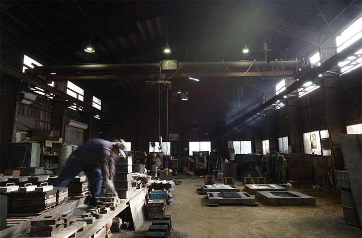 「砂は溶解した熱を吸収し発散させる鋳造にぴったりの、昔ながらの製法。砂型だと何個つくっても、ばらせばまた同じようにつくれる。熟練の職人が自分で手込めするので、繊細なつくりのものでも対応できる。小ロットでも試作でも、比較的簡易につくれるのが強みですね。」