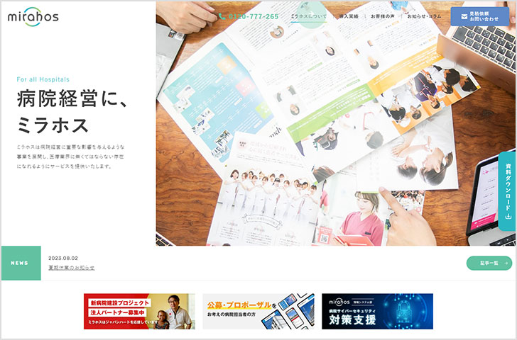 創業時から展開していた企業のホームページ制作・運用サービスを、病院業界に特化してサービスを開始した「病院webider(ウェビダー)」。2012年以来、関東・関西を中心に地域医療の中核となる総合病院をユーザーとして提供していたこのサービスを、2021年に「ミラホス」としてブランドリニューアル。現在、約400の医療法人と契約し、500を超えるホームページを制作。運用後はホームページのフォローアップ、カスタマーサービスなども展開しています。