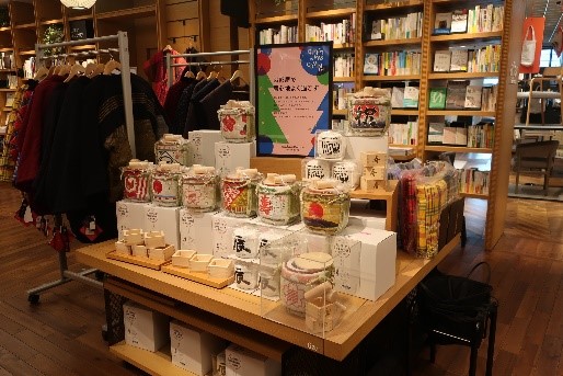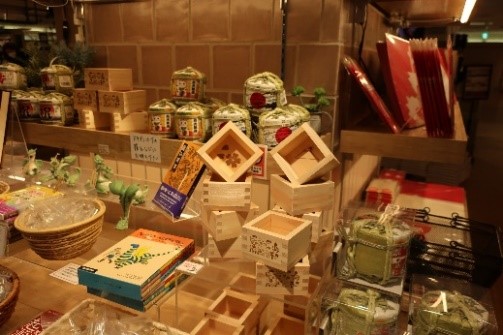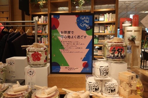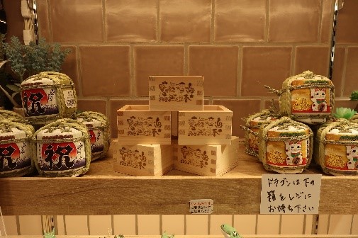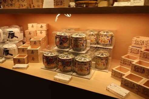 物販売場は雑貨が多いため、低単価な小さいかざり菰樽と木枡を中心に展開しました。