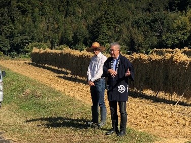 当社では昔ながらの菰樽の製法を残していくため、毎年秋に稲わら確保のための稲刈りを神戸市北区の農家さまにご協力いただき、行っております。当日は社員以外に、稲刈り体験イベントとして一般のかたにもご参加いただきました。