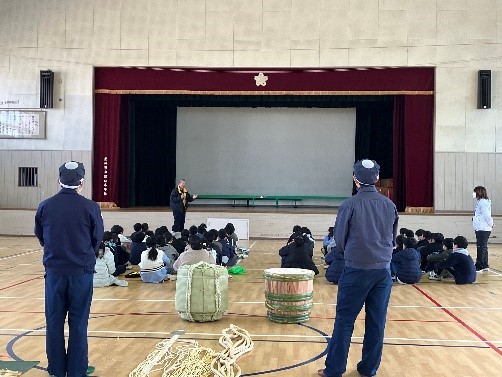 毎年、尼崎市立塚口小学校5年生を対象に「菰樽のお話と菰巻きの実演」の出前授業を行っています。菰樽の事を知ってもらうとともに、子供たちに自身の出身地に対しての郷土愛を育むことを目的としています。