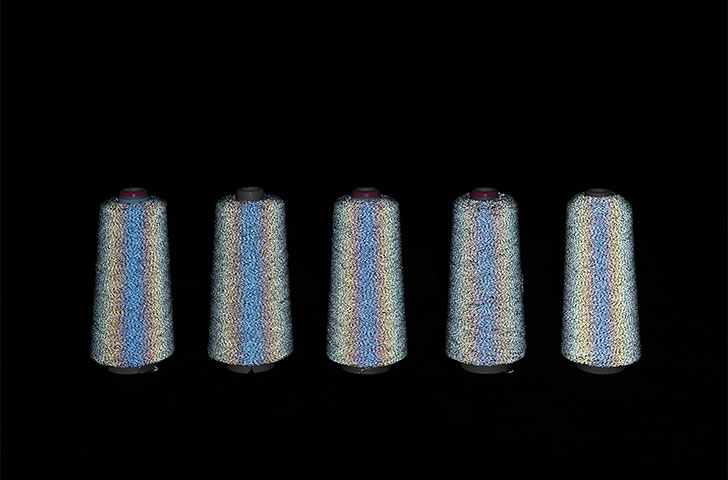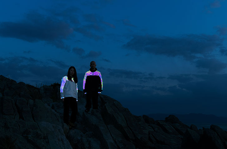 その事業転換を支えたのが、同社の特許技術による素材群です。中でも反射する光がオーロラのようにグラデーションする再帰性反射材「オーロラリフレクター®」は、日本以外にアメリカ、ドイツ、フランスで特許を取得している同社の看板素材。この「オーロラリフレクター®」を含むファッション性に特化した反射材シリーズを『LIGHT FORCE』と名付け、反射材本来の「安全」というテーマだけに縛られないファッションの一部として展開しています。