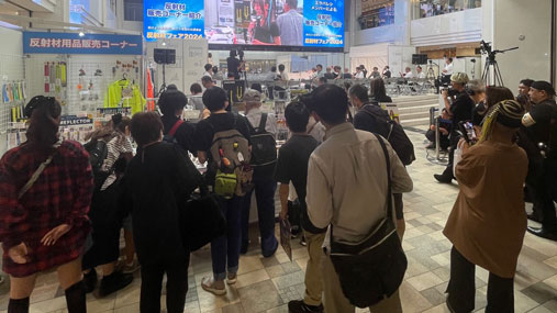販売ブースはイベント開場前から老若男女の多くのお客さまに訪れていただきました。普段、これだけの種類の反射材商品がお店に並ぶことはないため、多くのお客さまにご自身の気に入った商品を選んでいただけたと思います。