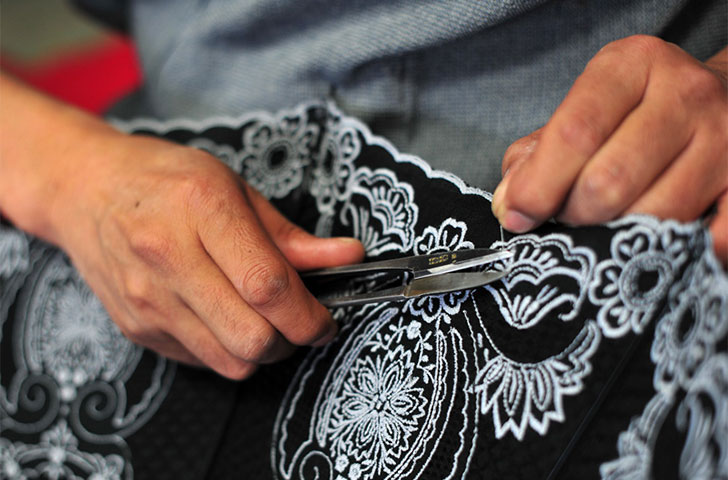 同社では、福井県産の素材と技術を活用した全工程手づくりでものづくりを行っています。福井の地場産業である繊維・眼鏡・漆器の技術に、自社保有の最新機器による素材づくりを融合させることで、自由度が高く、小ロットの製造にも対応できる独創的なものづくりを実現。看板商品である布張りで仕上げた『蛇の目洋傘』や、大島紬や友禅など日本が世界に誇る織物や染物と職人技による生地を使った『伝統文化高級傘』など、工芸色の強い、まさに逸品と称されるラインアップを主力商品として揃えています。