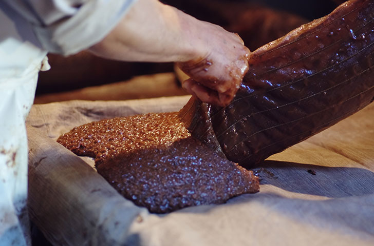 伝統製法を守り続ける同社の醤油づくりにおける大きな特徴は、醤油のもととなる「もろみ」を自社で仕込み、その「もろみ」を1年半もしくは3年間熟成させる「天然醸造」にこだわっている点にある。