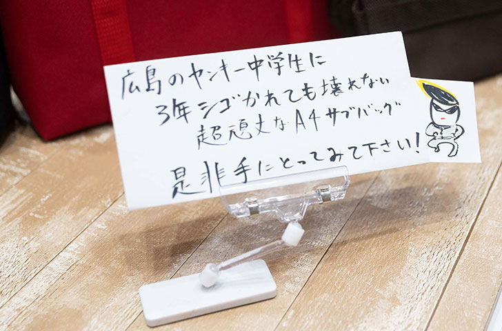また、中学校用に販売している補助バッグをベースに勧氏が開発したビジネスA4サブバッグ「さよなら紙袋」は、その機能性に加え、渋谷ロフトやハンズ広島でのポップアップイベントで販売されたことでも注目を集めて、現在同社の看板商品となっている。