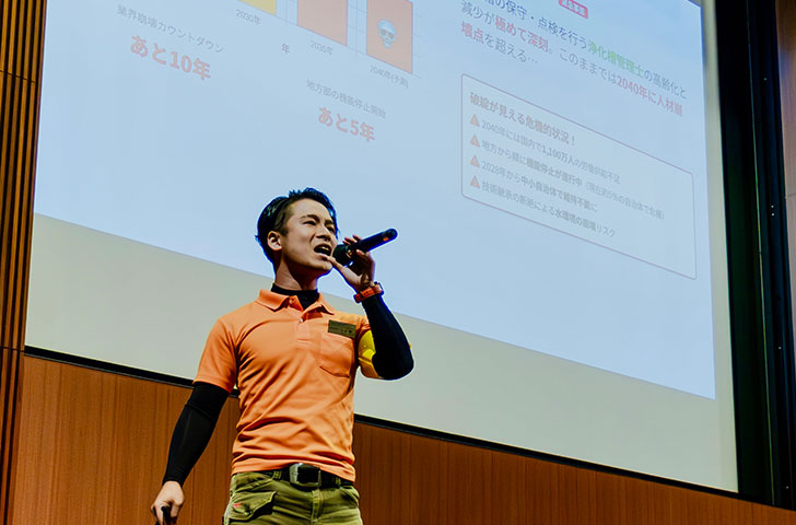 「今後30年間で、老朽化した下水道の維持や更新に必要な費用は38兆円と算出されています。これは地方自治体の財政を蝕む時限爆弾になっていると私は考えています。財政的に下水道の更新に耐えられないからと、すでに複数の自治体が下水道から浄化槽への転換を行っています。しかし、浄化槽に転換しても、それを管理する人間がいない。その問題を解決できるのが私たちの遠隔監視システムであり、地方の財政を救う現実的な一手になるのではないかと考えています。」