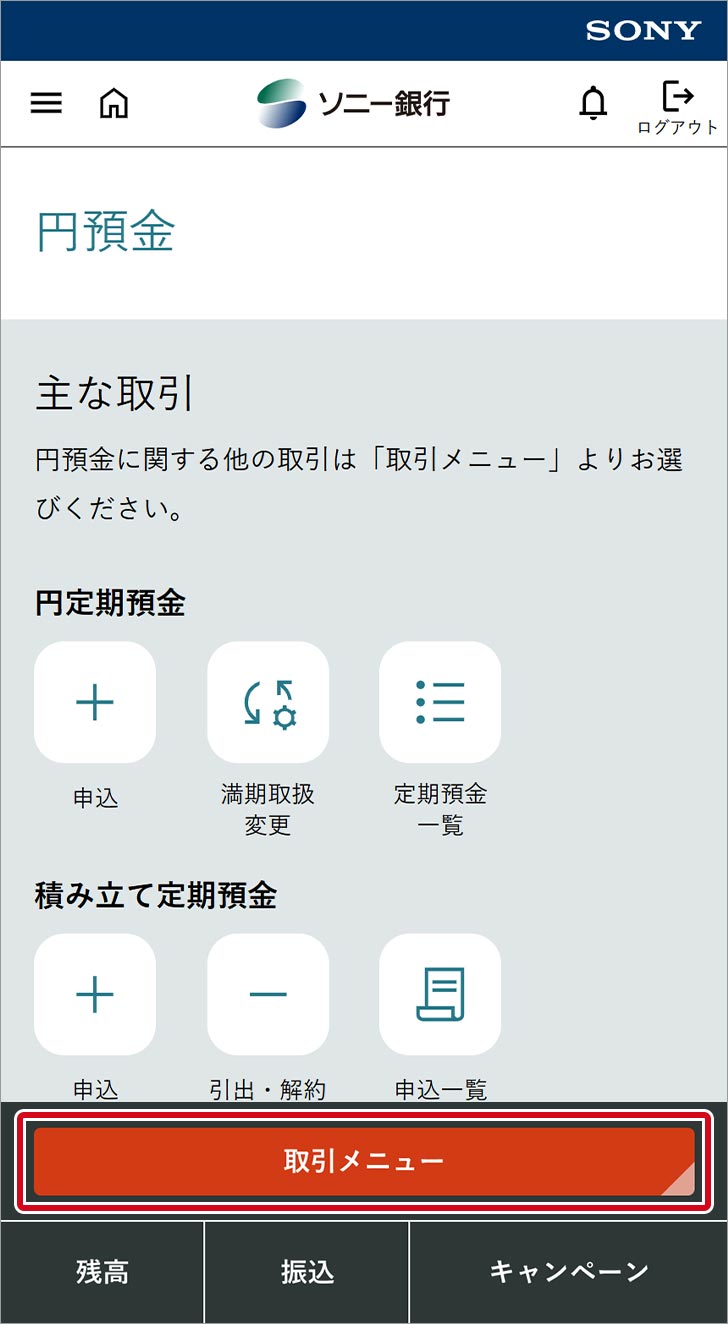 - 「取引メニュー」を押し、円定期預金から「申込」を押してください。